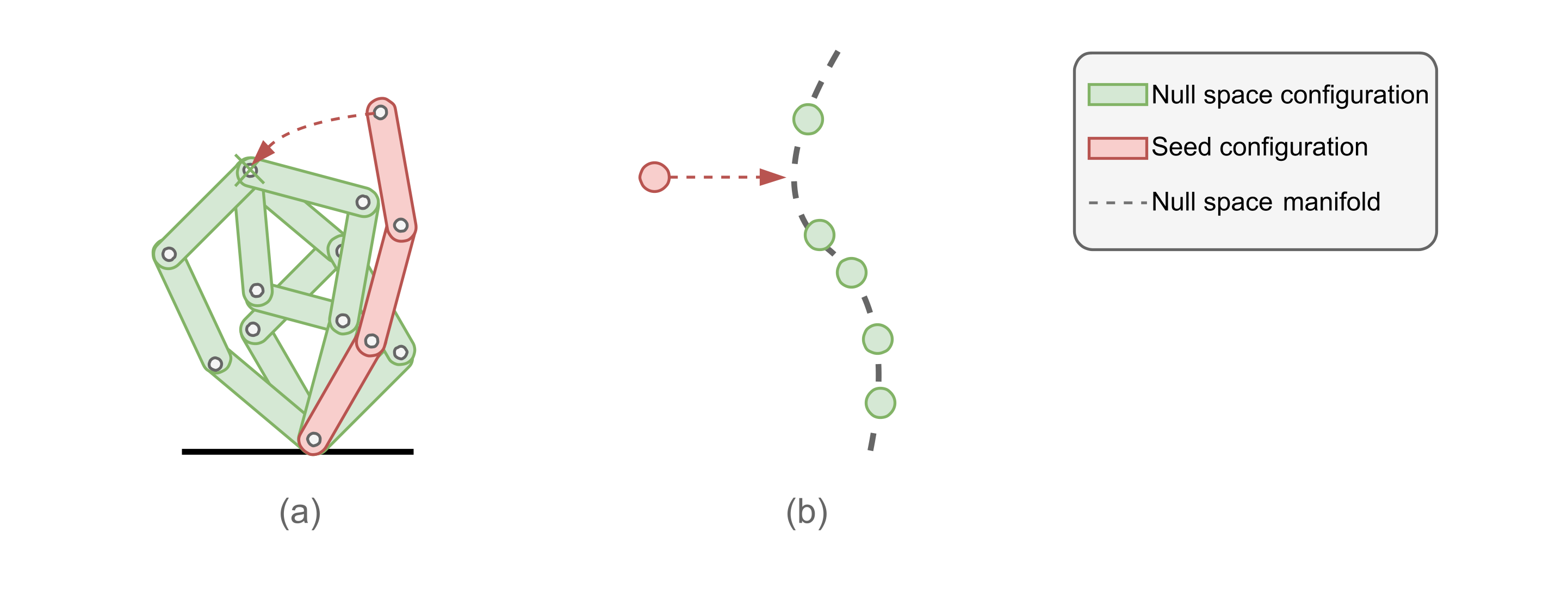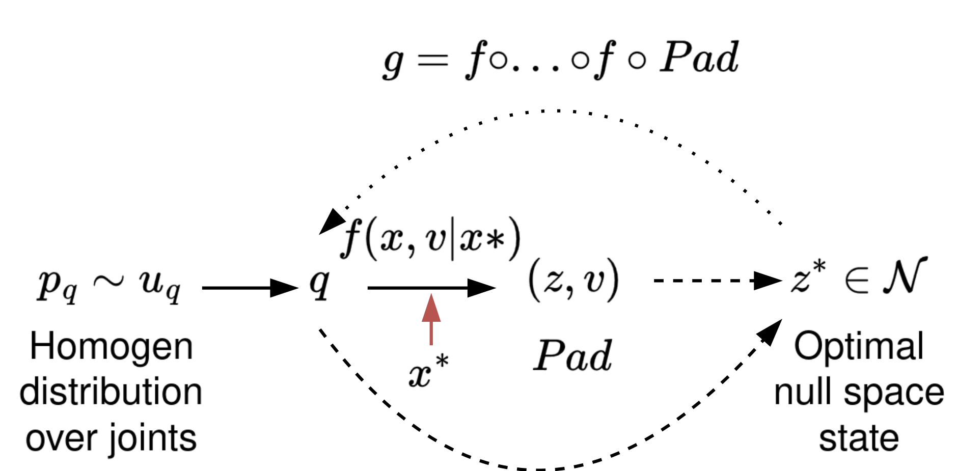 Idea: Leverage manifold flows (Normalizing flows + zero padding) to learn a latent nullspace state given target pose and project current joint state into it