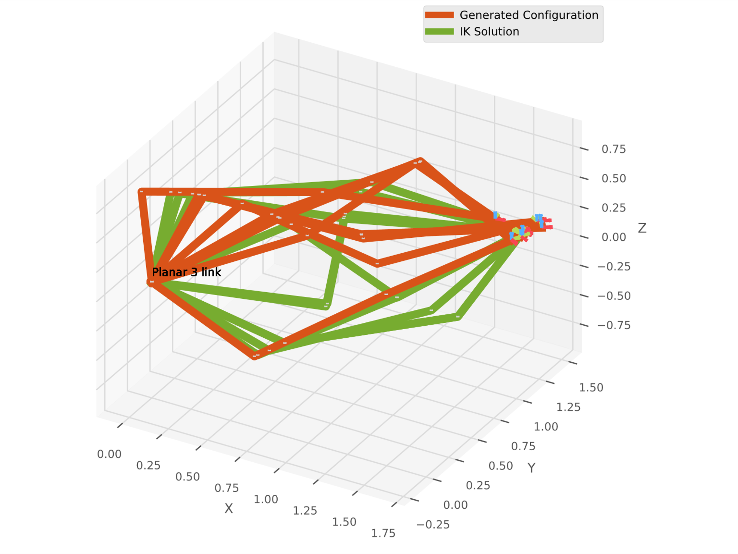 The model is trained with \(125000\) sampled joint states from an 3 DOF robot arm. For testing \(100\) seed configurations and one target position (not in training set) are sampled from the robot simulator. Then the target configuration is predicted. For reference the IK solution using Levenberg-Marquardt (LM) algorithm is calculated. The resulting target pose has currently a position error of approx. \(1\text{cm}\).